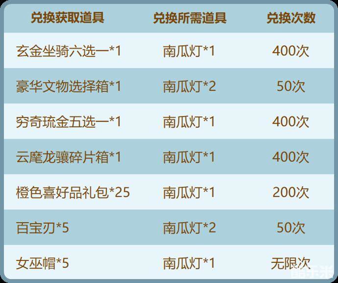 「南瓜灯」可用来兑换玄金坐骑六选一、穷奇琉金五选一、云麾龙骧碎片箱等稀有资源: