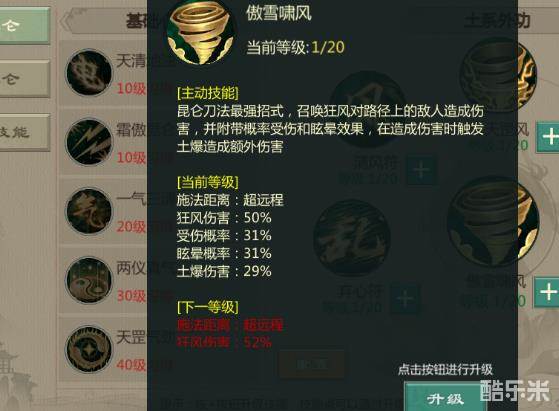 先来看一看刀昆仑,这个定位只可以使用剑系的武器来进行输出,被动是提升剑系武器基础攻击力的。虽然说昆仑是一个土属性的设定,但是刀昆仑分支技能都是狂风类型的。比如说基础的傲雪技能,这个技能是超远程的技能,召唤狂风来对路径上的敌人造成伤害,同时有几率附加一个受伤和眩晕的效果,同时还会有土爆的额外伤害来。