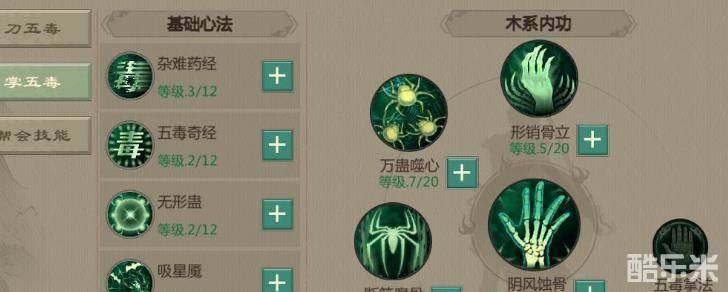 刀五毒:刀五毒和掌五毒的基础心法都是一样的,可以带来抗性、恢复速度以及攻击和命中的提升,这两个心法不管是玩那个分支都是要做好提升的。刀五毒的刀法技能可以提升使用刀系武器的伤害,这个是必要的提升。