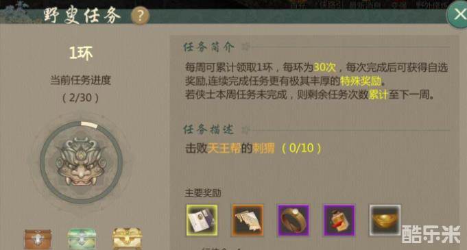 当玩家等级到达18级即开启野叟任务,每周可以累计领取一环,每环为30次,每次完成后可以获得自选奖励箱,连续完成任务更有极其丰厚的特殊道具,若玩家在本周任务未完成,则剩余任务次数累计至下一周。