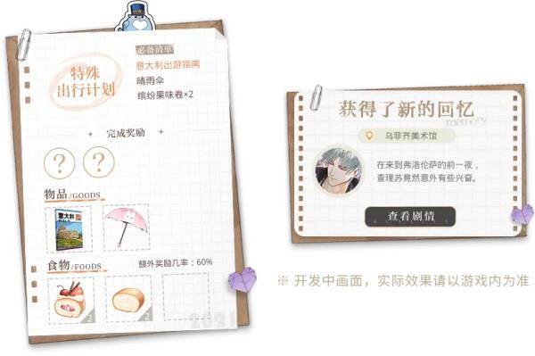 在这次与查理苏的异国之旅中,设置了【普通出行计划】和【特殊出行计划】,特殊出行计划中会指定特殊携带品【意大利出游指南】,将会触发和他打卡意大利著名景点的特殊剧情。每次城市穿行会消耗一定时间,结束时可获得灵犀培养材料奖励。解锁特殊剧情或日记还可领取小熊星座奖励。