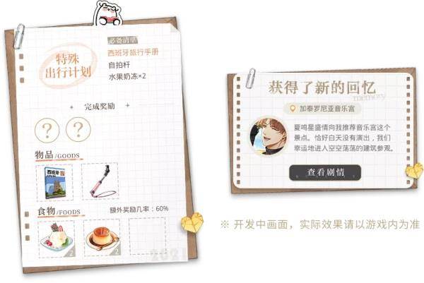 在这次与夏鸣星的西班牙之旅中,特殊出行计划会置顶携带特殊携带品【西班牙旅行手册】,将会解锁与他一起打卡西班牙大大小小知名景观剧情。漫游城市需要一定的时间,漫游归来即可解锁对应景点的专属剧情或日记,同时还可获得灵犀培养材料奖励。解锁特殊剧情或日记还可领取小熊星座奖励。