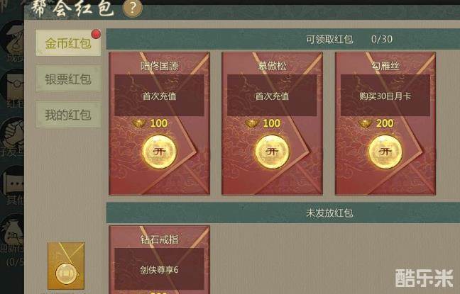 在加入到帮会之后,玩家进入到帮会界面中,在左侧这里可以看到一个红包的图标,点击之后就可以进入到红包的界面了。在这里可以看到成员的红包奖励,点击打开的话就可以获得金币了。一般来说金币的获取是很少的,一次可以获得几个金币的奖励。除了金币之外,红包还有银票红包的设定,这个是氪金的,不建议大家去尝试。