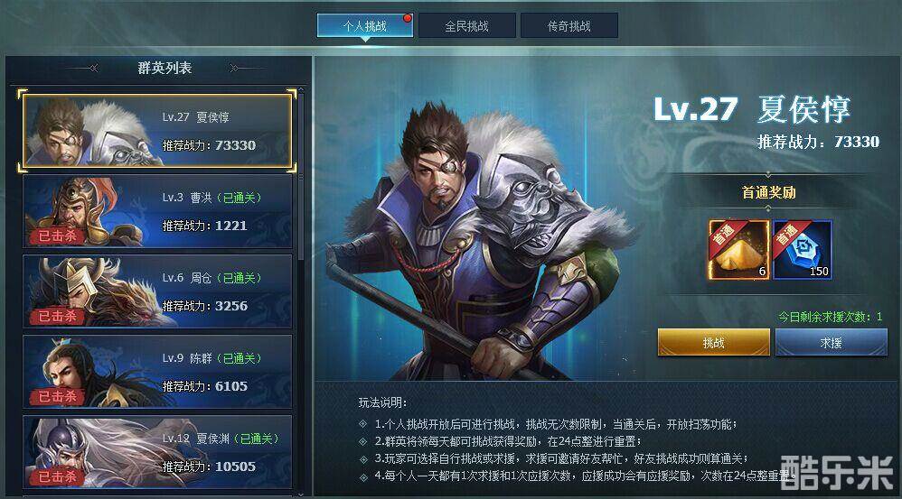 个人挑战开放后,玩家可以进行挑战,挑战无次数限制,当通关后,开放扫荡功能。群英将领每天都可以挑战获得奖励,个人挑战将会在24点整进行重置。玩家可以选择自行挑战或者求援,求援可邀请好友帮忙,好友挑战成功则算通关。每人每天都有1次求援和1次应援的次数,应援成功后会有应援奖励。