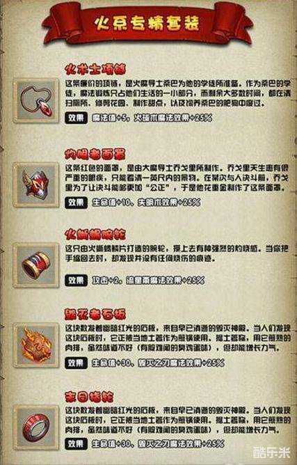套装效果:攻击+12、魔力+12。火系魔法效果增强25%,获得元素球魔法(该魔法不消耗卷轴)