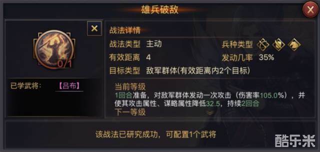 输出型战法除了【雄兵破敌】等直观的输出战法之外,辅助输出类战法例如【神兵天降】、【大赏三军】等也划归此列。