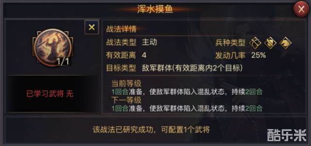 控制型战法主要包括具有混乱、暴走、嘲讽、犹豫、怯战等对敌军造成有效控制的战法,例如【浑水摸鱼】等。