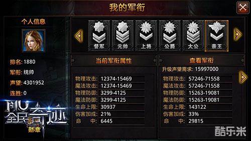 在全民奇迹的大陆上,挑战是永不改变的话题,勇士们不断的冲向阶级的顶点,突破自我的极限,而军衔则是勇士们战斗胜利的最好象征!在游戏过程中,玩家可以通过竞技场、每日膜拜等方式获取声望点,当声望点达到一定标准后,就可以进行军衔升级。军衔能够可提升角色的生命上限、攻击力、防御力和命中等大量属性。而最重要的是军衔可以提升玩家的伤害加成,值得一提的是伤害加成是按照比例增加的,这也就意味着伤害的比例会根据玩家属性的提升而提升,尤其到了强大的后期,伤害加成的增加可谓是不可小觑的。