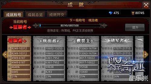在《全民奇迹MU》中,成就是对所有玩家的最高嘉奖,成就系统往往见证了勇士在奇迹大陆上的所有功绩。当玩家完成游戏内指定的任务后,就会获得一定量的成就值,玩家使用成就值在成就系统中升级成就称号,成就称号等级越高,角色附加的属性就越高。其实细算下来,军衔与成就两个系统为玩家增加的属性相差不多,随着游戏的进行,玩家只要不断的在游戏中驰骋,完成每日的日常任务,长期的积累下来,即可获取成就点。