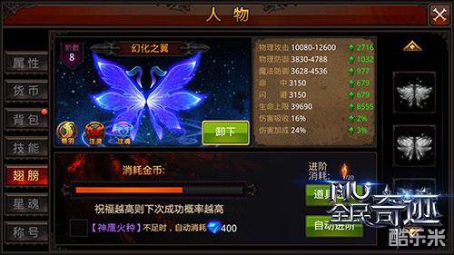 如果你问我《全民奇迹MU》最吸引我的是什么,我会毫不犹豫的告诉你:翅膀!《全民奇迹MU》的翅膀系统可谓是人见人爱,让无数玩家爱不释手。毫无疑问的是翅膀已经成为了奇迹勇士们身份的象征。随着不断的升级进阶后,翅膀的外观会变得更加的酷炫,还为玩家带来不菲的属性加成,其加成数量简直让玩家惊诧不已。翅膀的升级道具比较简单,玩家只需要消耗羽毛就可以对翅膀进行升级。当升级到十级后则需要消耗神鹰火种进行进阶。与装备系统不同的是,翅膀的升级进阶不会失败,尽管进阶的时候也存在一定的概率,但是只要玩家不断的注入道具,那么就一定会成功。除了强大的属性与炫酷的外观外,翅膀还拥有翎羽、注灵、注魂等玩法,玩家只需要消耗少量的道具就可以获得大量的属性加成,可谓是十分划算!增强属性,提升战斗力,翅膀将是你难以抗拒的致命诱惑。
