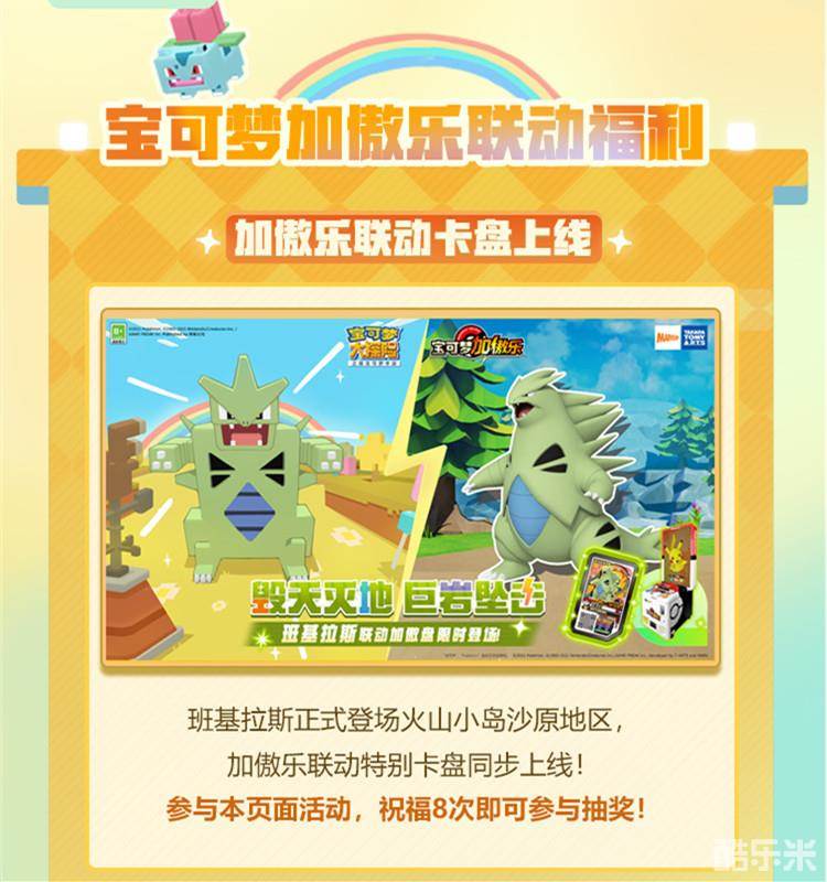 随着新地图的开放,更多新伙伴来到了探险家的营地外围,班基拉斯就是其中一员。《宝可梦大探险》与加傲乐联动涵盖线上线下双重领域,专属“加傲乐联动卡盘”惊艳现身。这里班基拉斯作为卡面主角亮相,“毁天灭地巨岩坠”完美诠释它的“强力”何在。《宝可梦加傲乐》从2020年年底开始运营,目前是中国市场上最受欢迎的卡片游戏机之一。
