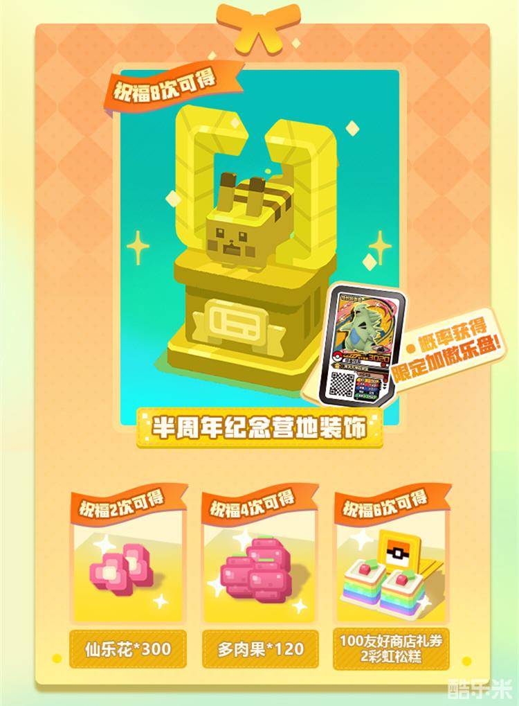 想要获得限定的“加傲乐联动特别卡盘”,探险家可以前往《宝可梦大探险》官网,登陆活动页面,为《宝可梦大探险》送上祝福,随着祝福次数的增加可以不断收获惊喜回馈。前期探险家可以得到大量仙乐花、多肉果等道具,当次数达到6次时,可以收获珍贵的友好商店礼券和彩虹松糕,而当祝福达8次时,不仅可以得到专属的营地装饰道具,还有概率获得限定的“加傲乐”盘!