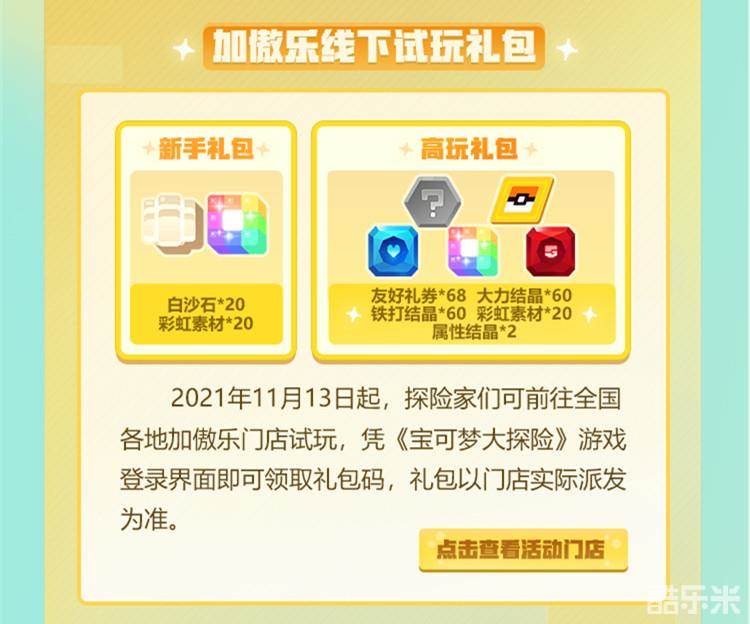 而在线下活动中,探险家们可前往加傲乐门店参与游戏,然后凭借《宝可梦大探险》的游戏登录界面领取专属试玩礼包码,对应礼包含有大量游戏材料,包括白砂石、彩虹素材等新手礼包,也有友好礼券、铁打结晶、大力结晶、彩虹素材、属性结晶等高玩礼包。