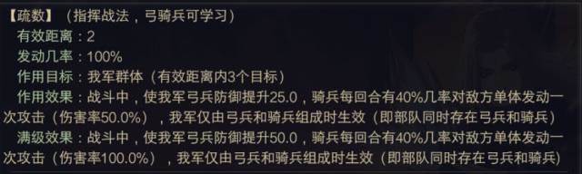 做为征服赛季三大四星战法之一,【疏数】显得低调许多,而且改版之后限定队伍只有弓兵和骑兵时方可使用,看起来略显苛刻,但是它弓骑搭配的要求实在是无比符合当下的需要。
