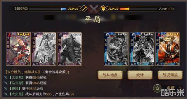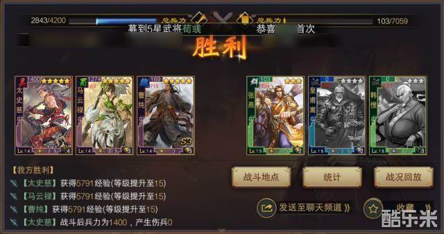 虽然太史慈和马妹都是强力武将,但目前太史慈的输出不如每回合连续攻击两次的马妹输出稳定,因此将马妹做为队伍的输出核心。既然是核心那么另一个战法就需要是输出战法了,这里强调一点,在开局初期高触发率远比高伤害率要有用,所以35%几率的【掠敌之利】要比【怯心夺志】、【钝兵挫锐】都要好用一些。