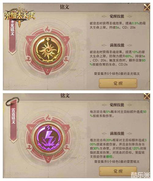每种铭文内都蕴含强大魔力,根据类型不同赋予玩家的属性也各有不同。《荣耀大天使》铭文分为器、魂、灵、佩、枢五大类,每类铭文又细分为6种不同铭文。雷霆、圣光、烈焰、蚀骨、守护、迅捷。同级别铭文(目前铭文品质从低到高:绿-紫-橙)属性一致,不同的是佩戴一套铭文后的属性加成方面各有不同。对应佩戴5个同种铭文后可激活的套装属性也不同。但想要凑齐一套高级铭文并非易事,前期玩家可以考虑低级铭文过渡。(铭文对于战力和PK的效果提升巨大。)