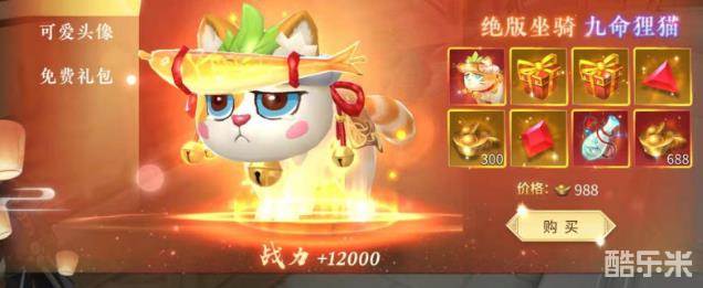 4.可以在0元购界面花费988元宝购买礼包,其中包含九命狸猫绝版坐骑。