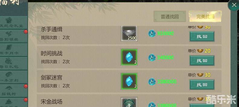 再来介绍一下找回的一些机制,在找回中是分为普通找回和完美找回的。简单来说普通找回就是获得玩法的部分奖励,而找回的资源花费是银两,这个基础货币大家瓯都是比较多的,所以说使用起来也不会心疼的。