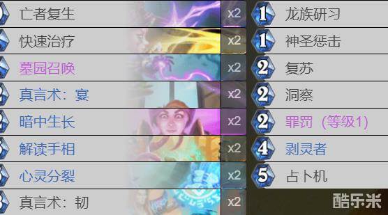 在占卜机牧的起手留牌方面,主要是以快速治疗,墓园召唤,龙族研习,神圣惩击,复苏,洞察,罪罚(等级1),真言术:宴,暗中生长,解读手相,心灵分裂等低费卡牌为主。