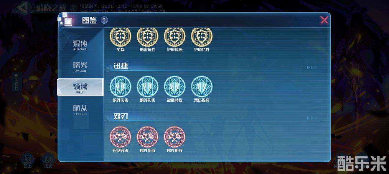 ③混沌领域:有四种领域-终结、生存、迅捷、双刃,每局会从这四种领域中随机选取两个领域,然后从这两个领域中各抽一个buff给混沌方亚比