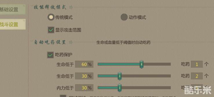 接下来就是吃药设置了,这个吃药的话是有两个选择的,一个是低于多少百分比的时候吃一瓶药水,低于多少的时候吃两瓶药水。这和触发的百分比,建议大家稍微设置高一点,可以帮助角色很好的保持血量。内力药水的话就看门派了,消耗多的就设定高一些比较好。和吃药相关的还有自动补药和一个轮盘补药,这个轮盘的话不建议开启,操作相对的繁琐。