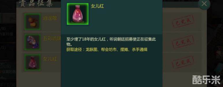 玩家进入游戏后,可以在主页面中看到多种道具,玩家进入游戏后,可以在主页面中看到包括多种不同的道具,其中包括女儿红道具,至少埋了18年的女儿红,听说朝廷招募此物,此物可以通过多种方式获得。