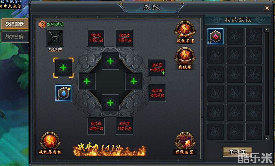 各种战纹镶嵌槽都是锁定状态,玩家需要通关对应的战纹塔,可以将各种战纹镶嵌槽解锁掉。玩家镶嵌各种战纹后,除了可以获得战纹属性外,战纹集齐对应套装,也可以激活套装属性效果,还可以解锁战纹技能。
