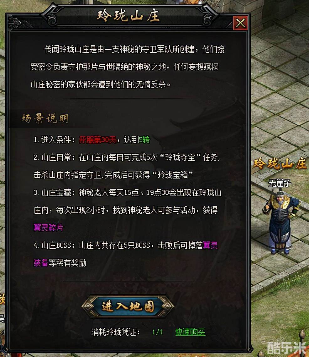 血饮传说玲珑山庄是一个神秘的地图,这张地图是大伙打宝的地图,这张地图内可产出大量的神翼装备,让你拥有更高的战斗力的。玩家要想进入玲珑山庄,也可前往比奇省右上方的城门口位置,找到NPC“无崖子”对话,即可传送进入这个地图。