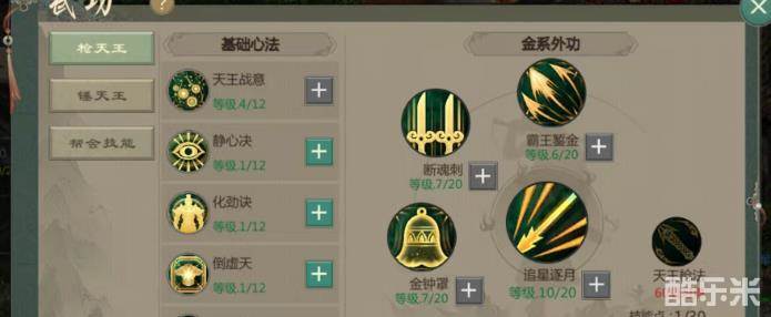 在心法方面,天王战意,化劲决,倒虚天这三个是必须要点满的,天王战意增加的是枪天王的基础生命值,天王本来就是血量高而著称,这个技能就是基础。化劲决增加的是全队的生命值,很多队伍组天王为的就是能增加血量,这样在很多活动的时候就好通关了。倒虚天增加的是枪天王的生命值恢复速度和全系抗性,没有抗性现在是非常难混的,五行属性伤害在很多时候才是最大的威胁。
