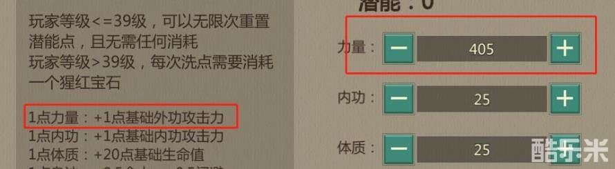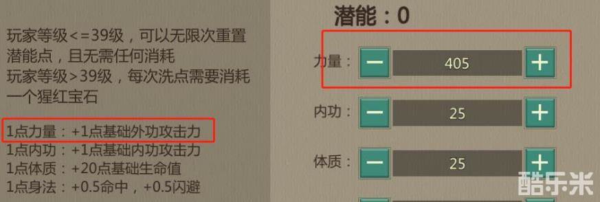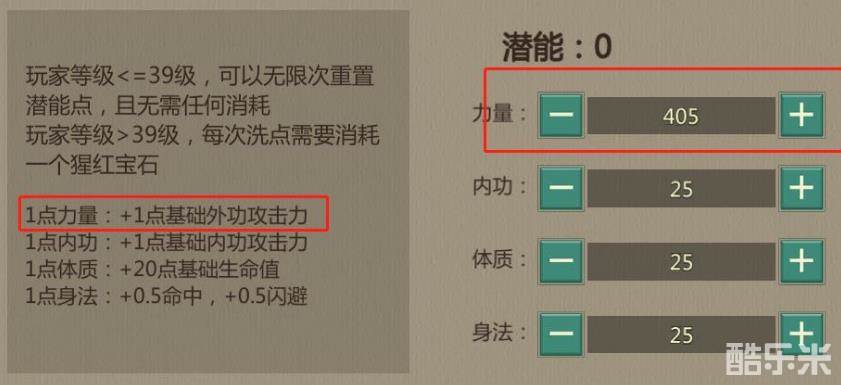 人物升级获得的潜能点,全部加力量,前文中提到,飞镖唐门定位是外功群攻远程输出,自身输出环境比较安全,因此加点只用考虑输出最大化,力量和外功攻击力挂钩,因此全加力量。