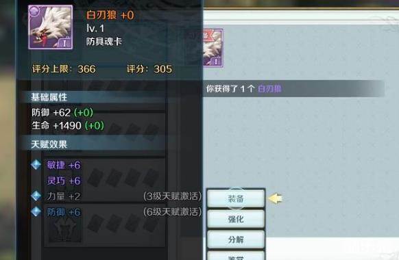 那么先来介绍一下魂卡的操作,点击一个魂卡之后,显示出对应的属性以及操作选择,点击其中的装备之后就可以装备在对应的位置上了。不同的魂卡有不同的属性,这个大家在选择的时候还是要注意一点。使用的方式是相对较为简单的,操作一下就回了。
