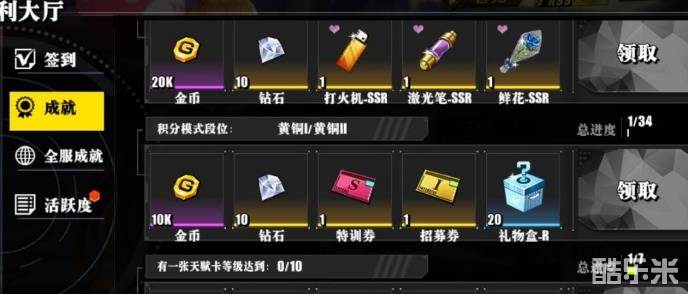 成就在游戏首页左侧的第二个小标中,在成就领取的右侧上方会有一个进度提示,当进度接近满值的时候,就能够获得成就奖励。其中一个成就,当玩家的积分模式段位达到黄铜1/黄铜2的时候可以获得一张招募券。