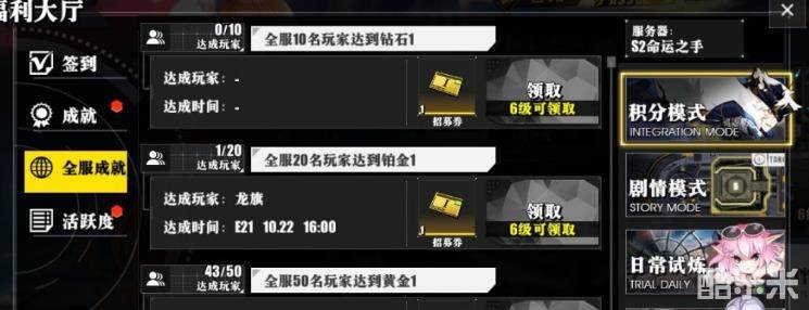 全服成就有一个前提条件,那就是玩家必须达到六级才具备领取奖励的条件。全服成就是由整个区的人一起行动的,当其中有人完成全服成就中的任务时,该服的其他玩家就能得到相同的奖励。在这里玩家可以获得三张招募券,之后就是钻石奖励了。