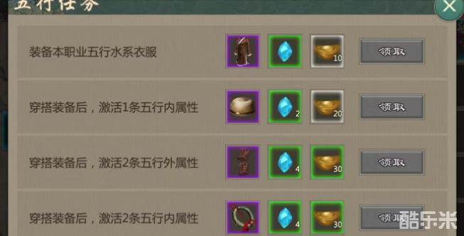 在五行中包括五行任务,通过装备本职业五行水系衣服可以获得多种不同道具,穿搭装备后激活一条五行内属性可以获得相应的奖励,当成功穿搭装备后,可以激活两条五行外属性和两条五行内属性即可分别获得多种装备道具,玩家可以通过五行激活方式获得内功,闪避,体质,会心,力量等多种不同的属性奖励。
