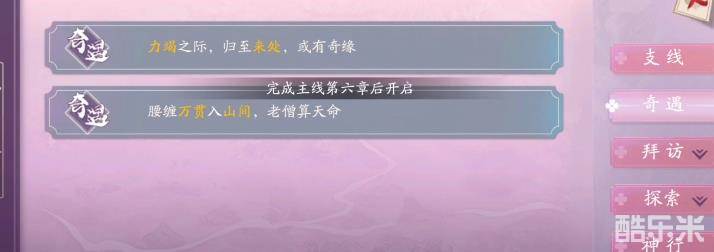 奇遇这个玩法解锁也是有条件的,在游戏中奇遇是分为地图奇遇以及任务奇遇的。任务奇遇的话在任务界面中选择奇遇就可以进行查看,这些奇遇的开启是要第六章的时候才有的,还是有一定进度要求的。而地图奇遇的话只要等级达到二十级就行了,这个要求相对来说会低很多的。