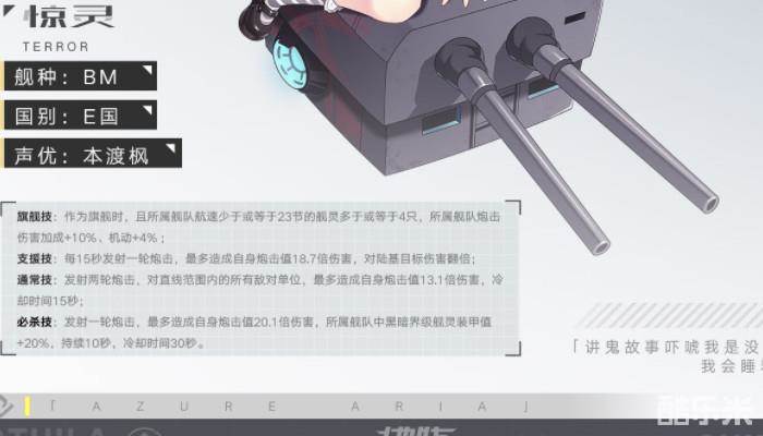 必杀技:发射一轮炮击,最多造成自身炮击值20.1倍伤害,所属舰队中黑陪界级舰灵装甲值+20%,持续10秒,冷却时间30秒。