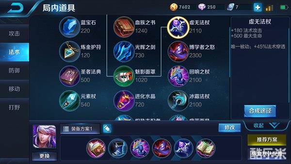 后期装备:到了后期敌方的坦克英雄都会出法抗装备,使得高渐离无法有效地对其造成杀伤,虚无法杖在提升高渐离生存能力的同时,提供的法穿效果使得高渐离可以对敌方坦克英雄造成不俗的伤害。贤者之书为高渐离提供了高额的法攻和生命加成,从而确保高渐离在团战中的存活并打出爆炸伤害。