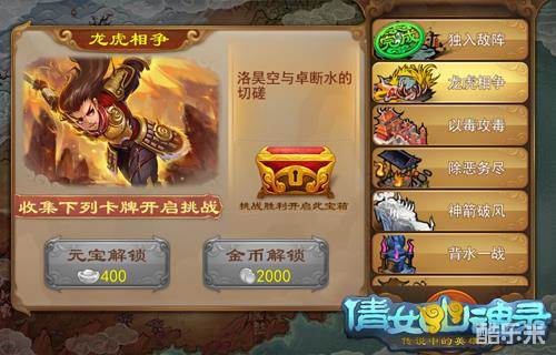 三界风云初变,波谲云诡,人间时不时传出妖魔横行、恶鬼作乱的耸人之事。有一批侠肝义胆的英雄不畏强权,勇敢踏上了降魔除妖之路。他们各自又有着怎样的故事呢?奇遇新场景侠肝义胆正式开放。本场景一共7关,每通过一关都会获得相应奖励卡牌。玩家只需花费一定数量金币即可解锁关卡。