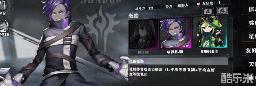 这三个角色在用一个阵容时可以激励组合技的使用,他们的技能效果是使羁绊者的攻击力提高。三者的羁绊能够让攻击力达到最大化,暗影君的战斗力使164、U7860K-R的为108,再加上DR.T-SR的最少有160,组合技使用下来,对敌方造成的伤害是不可小觑的。