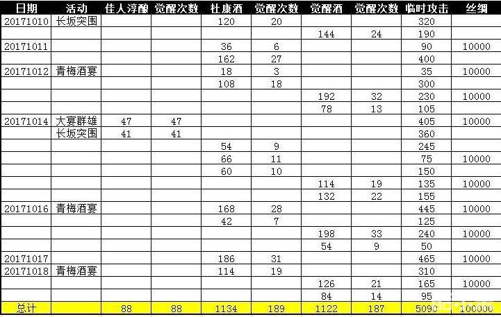 主城改造到最高后,每天民居可以产出50瓶杜康。由于走10珍招商需求并不算紧,日常那一点陨铁对3车总有些不够塞牙缝的感觉,因此每天的封地基本全部封了酒。加之最近觉醒活动出现频率颇高,似乎堂哥也在不断的吊玩家的觉醒胃口。因此,平均下来每天都能点个4,50次觉醒。心平气和每天手动慢慢点几十次吕布,并做了详尽的数据记录,倒想测试一下所谓的觉醒上限次数是否真的存在。具体的觉醒数据如下表所示: