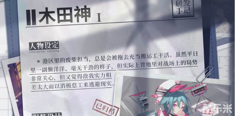 该角色可以算是港区里边的废柴担当了,因为总能遇见他被拉着去充当搬运工干活,平日里边看着懒洋洋的无精打采的样子,但是实际上对战场上的事情是非常关心的。