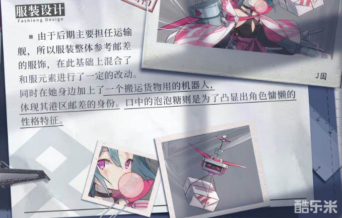 因为该角色在后期主要负责是运输舰,所以在整体的服饰上边参与了邮差的元素特点,额外还增加了一个搬运货物的机器人,技能体现港区邮差身份还能不失慵懒的调调。