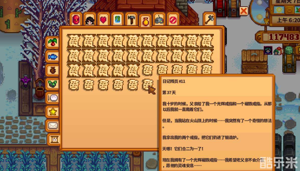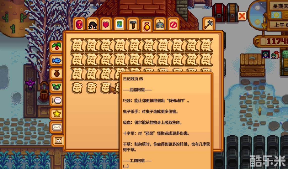 在上一个版本,我们可以通过在冬天遇到小黑人,然后获得放大镜后就可以获得秘密纸条了。在最新的版本当中,当玩家解锁了姜岛之后,我们就可以通过各种互动来获得日记残页,玩家可以在前期通过挖矿、种植、砍树等方式,都有一定的概率获得日记残页,但是要注意日记残页只能在姜岛上获得,并且玩家收集到日记残页并且打开观看之后,就不会再重新获得重复的日记残页了。