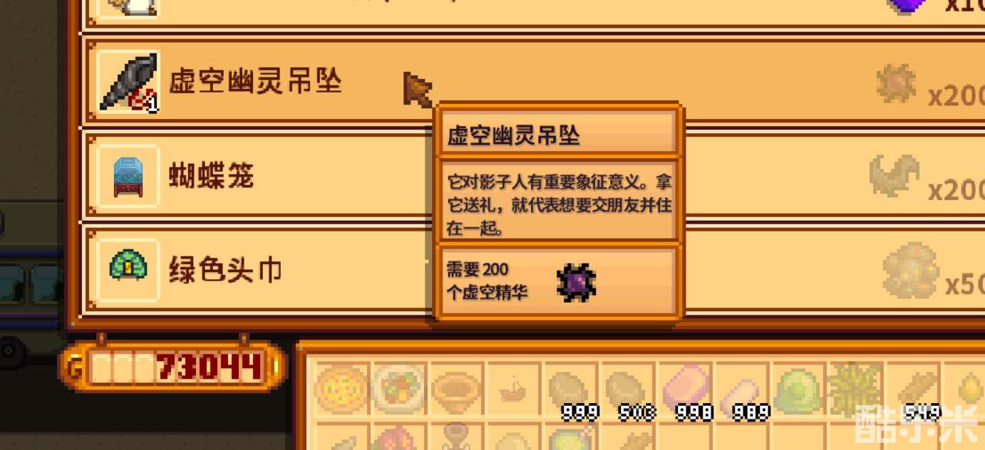 ①需要在玩家和科罗布斯的好感度达到满心之后,玩家在【星期五】去到沙漠商人处购买【虚空幽灵吊坠】。