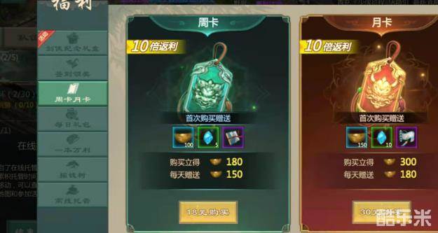 月卡是需要三十元购买,激活之后立即就可以获得元宝,玄晶,洗髓经的奖励,洗髓经可以增加自身的潜能点,提高角色的属性。之后每一天都可以获得一百八十枚元宝,这样算下来三十天就是五千四百枚元宝,而价格仅仅是三十元,非常超值。除了这两个一次性的花费外,一本万利这个投资也是要买的,只需要花费一千二百四十枚元宝,就可以购买这个八倍返还的超值基金,折算之后就相当于花费了八十元钱,得到了六百多元才能得到的元宝。