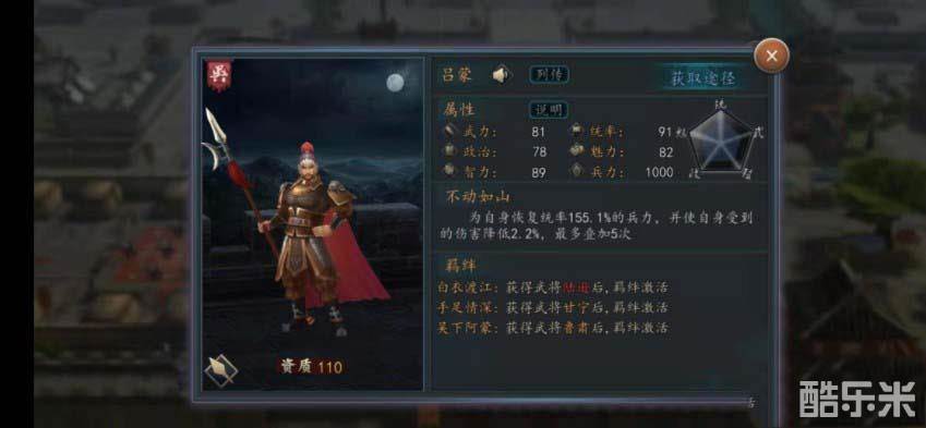 吕蒙资质110,武力值不算太高,统率值不错,技能不动如山为自身恢复统率值155.1%的兵力,并使自身降低受到伤害的2.2%,最多叠加5次。