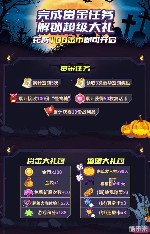活动期间,花费100金币购买“捣蛋大礼包”,同时开启赏金任务,只要您在活动结束前完成所有赏金任务,即可抱走“赏金大礼包”!