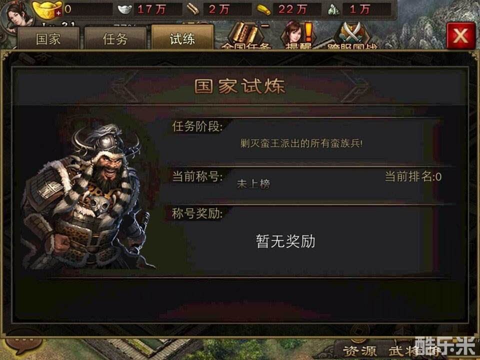 3级以上的国家,国家经验值达到要求,国王及一品官员即可开启国家试炼任务。国家试炼的战斗对象和国家升级一致,在历时2个小时的国家试炼过程中,攻打蛮族都城!