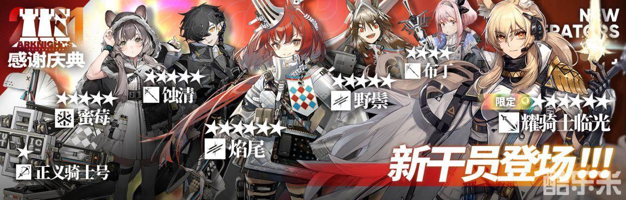 首先是玩家们最为关心的新干员,一共会有七名新干员登场。其中两名六星干员:耀骑士临光、焰尾以及五星干员蚀清会加入【循光道途】限定寻访。而五星干员蜜莓和四星干员布丁,玩家可以通过采购凭证商店兑换来获取她们。五星干员野鬃可以在【博士的办公桌-长期事务】的活动商店中换取,新一星小车干员正义骑士号则可以签到领取。至于本次开启的活动关卡,名为「长夜临光」,一共三个阶段,玩家们可以参与其中来获取超多奖励。另外,本次感谢庆典上线的皮肤也非常多,除了桃金娘新时装“淡金庆典”外,多款经典皮肤也迎来复刻。