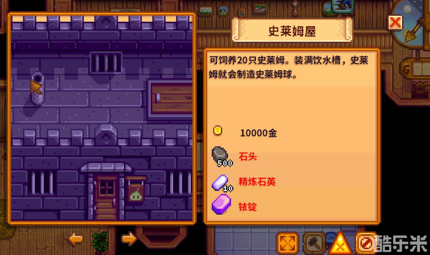 建造【史莱姆屋】的材料是石头*500、精炼石英*10(把石英放进熔炉熔炼得到)、铱锭*1(沙漠矿洞中采集铱矿炼制得到),需要3个工作日才能够建造完成。